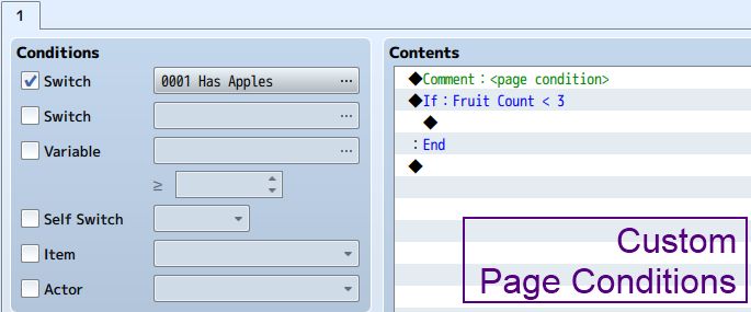 This plugin provides you with an easy way to define your own page conditions without having to come up with workarounds. If you want to check whether you have a certain weapon or armor, or whether a given combination of actors is in the party, you can directly specify this in your event.