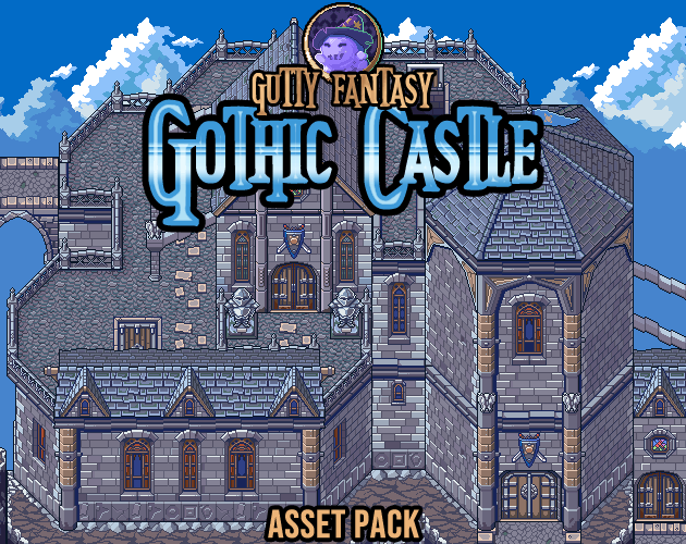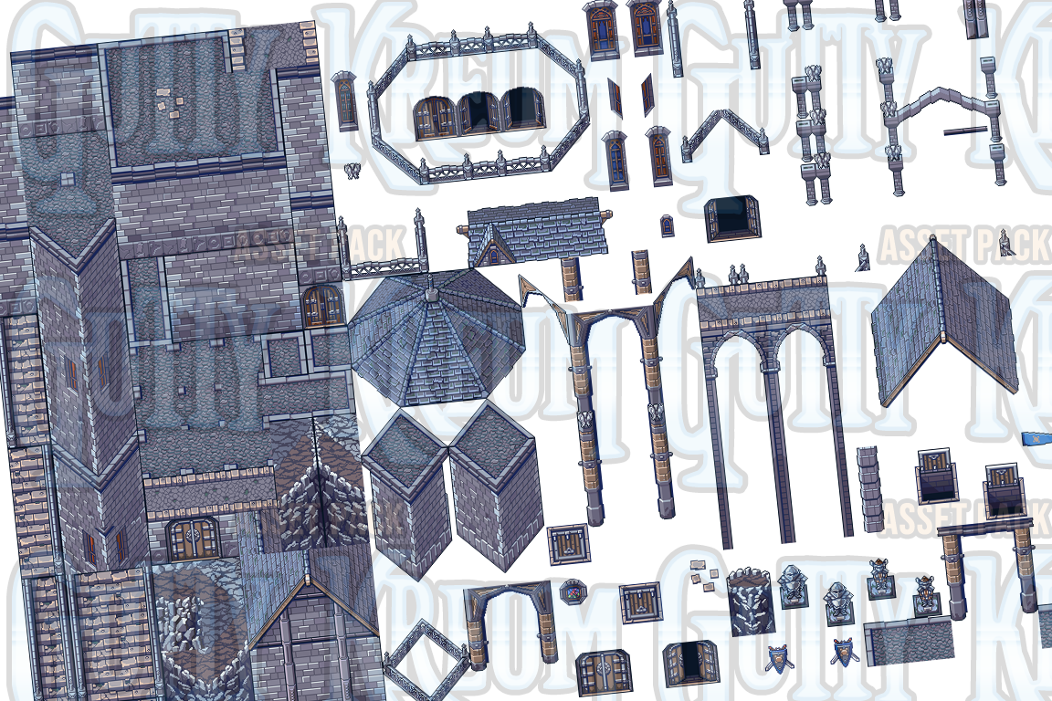 A looming castle set atop a dangerous and wind scarred mountain peak... Gothic style castle tiles are here to add an awesome look in your fantasy game project!