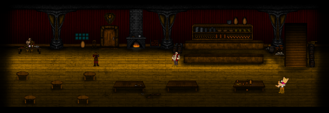 Inside the "Valiant Mastiff", a most infamous inn found in the city of New Cadedrann. Some quests will involve this establishment. This is an in-game screencap and the level is still in progress. A lot more characters will be added! And also, more trash on the ground. -___- All characters in my game will have their own personal animations.