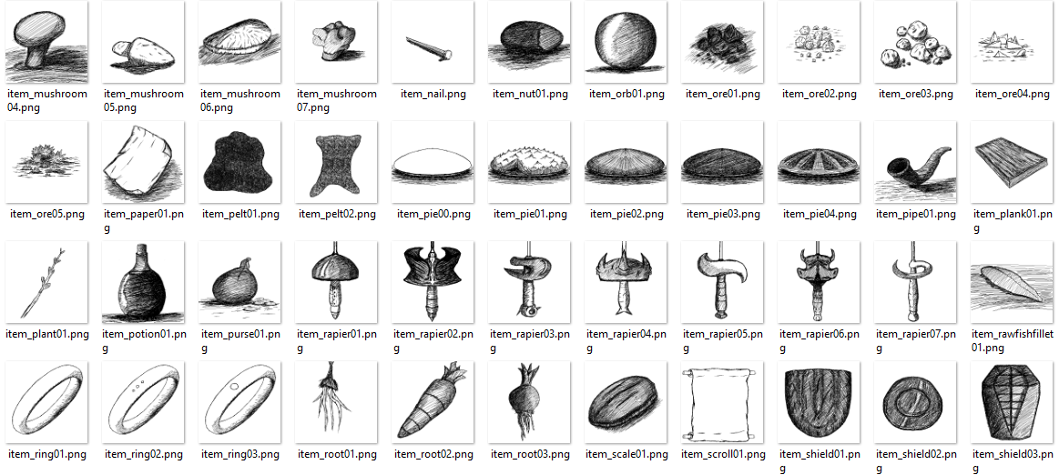 Items in the menu will be shown as if they had been drawn in a notebook by an explorer. As a matter of fact, I want my menu to look like an adventurer's notebook. This is a sneak peek of some of the items I've drawn for the game. As I'm writing this, I've drawn over 160 items!