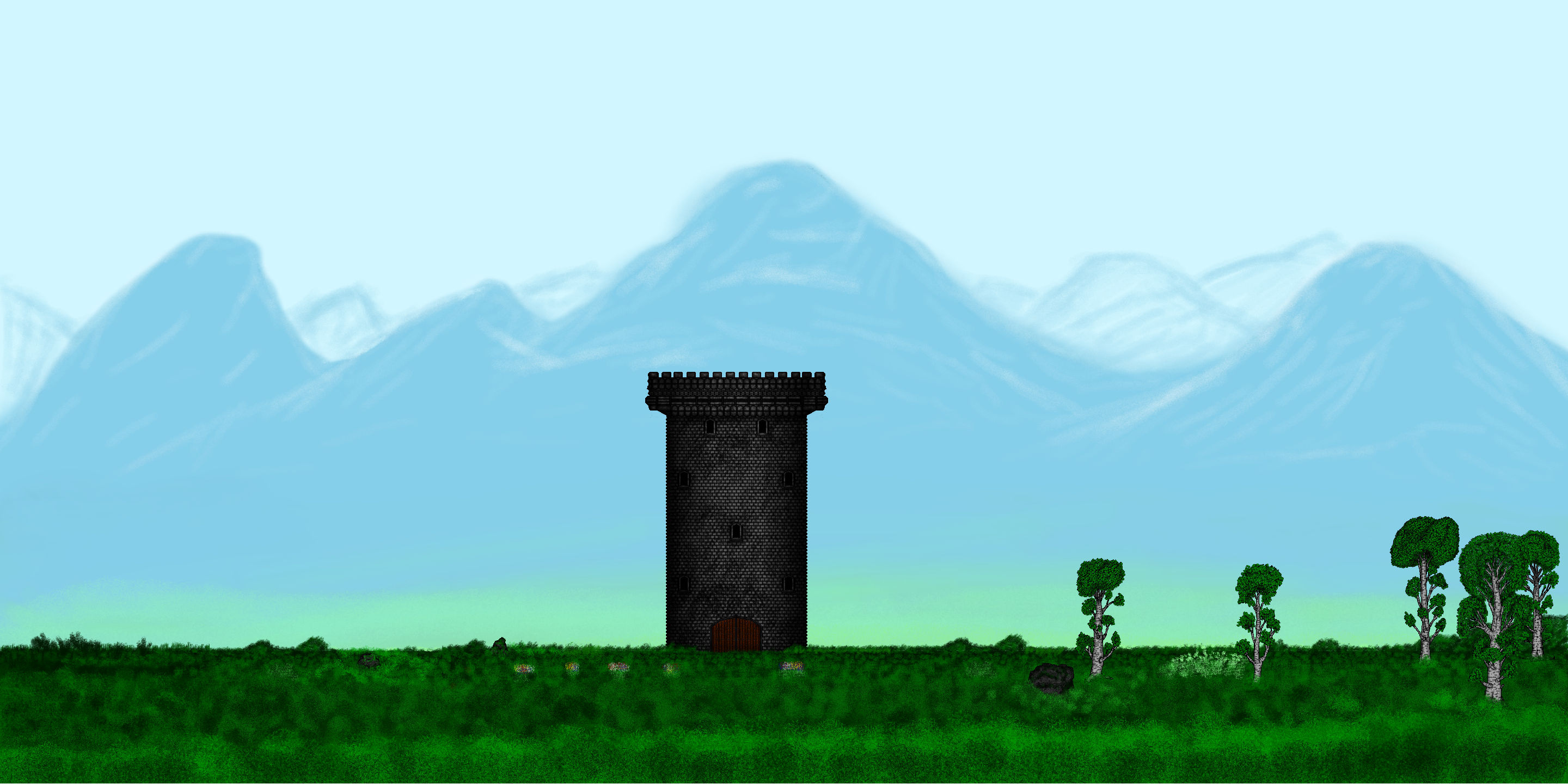 An early version of a level I've made. You'll be able to enter this tower named "Eagle Eye" which will be involved in a side-quest. As you might have realized, the background still needs a little work, which will be done eventually. It initially was a "test" level I've made early on in order to see whether or not my game could be done the way I wanted visually. Turns out it works! Right now, I'm not ready to "make" levels like this. I'm still drawing single objects like trees, houses, plants, etc. but soon enough, I'll be working full-time on making levels like this one, and trust me, they'll be much more epic.